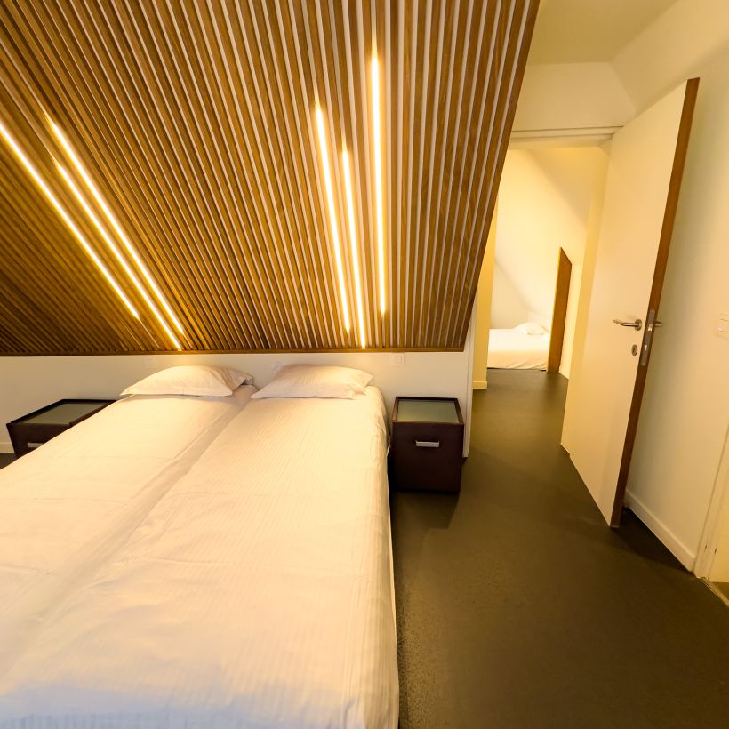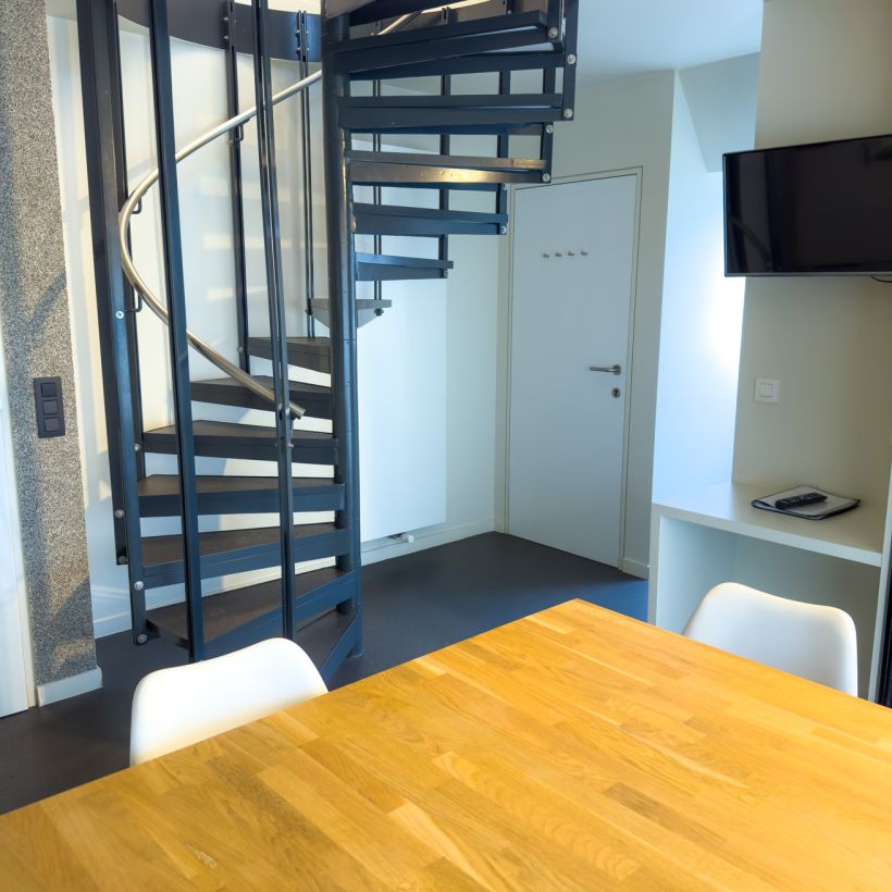 Cette chambre pouvant accueillir jusqu'à 4 personnes dispose d'une espace avec coin repas et une petite cuisine où vous pouvez chauffer ou préparer des plats simples. Les 2 chambres à coucher se trouvent au 2ème étage et chacune dispose de 2 lits séparés.